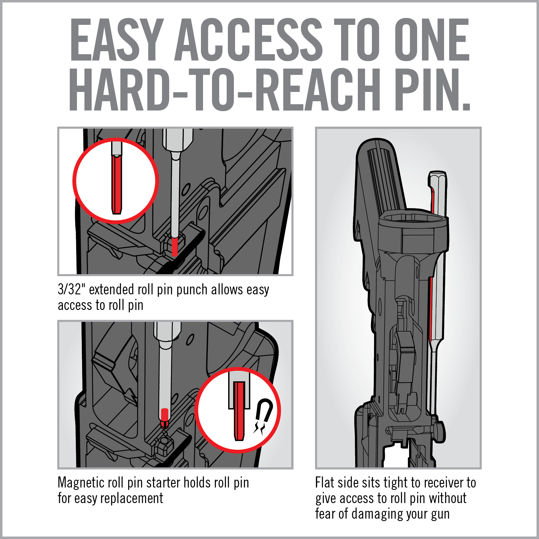 The pin’s position, its proximity to the lower receiver, and the challenge of safely starting it make standard punches ineffective. The Real Avid Bolt Catch Punch Set is designed to sit flush against the receiver without causing damage and is long enough to reach the pin. It includes a roll pin punch for pin removal and a magnetized roll pin starter punch, so you don’t need a third hand. Smart, simple, and frustration-free. Check out our other gun tools here.