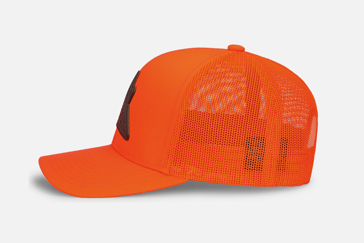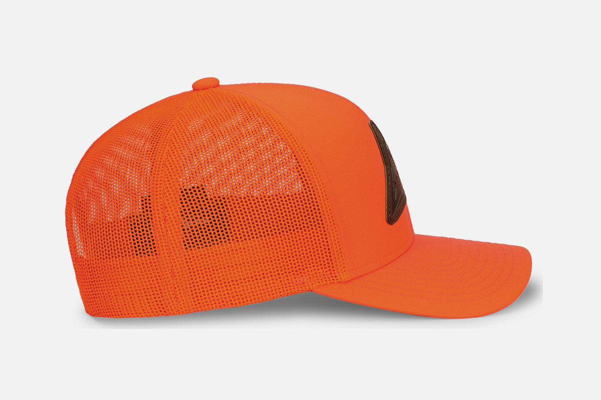 The RISE Blaze Orange Hunting Hat offers comfort, style, sun protection, and a custom fit with a leather patch and breathable mesh.