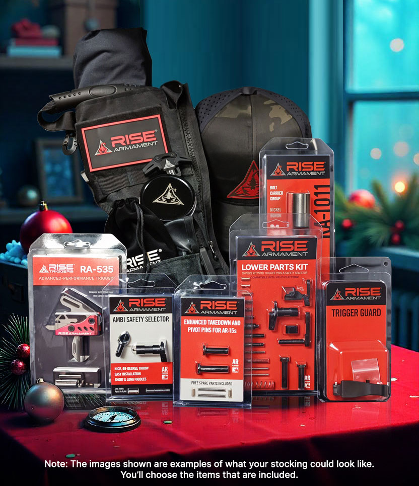 The RISE Holiday Tactical Stocking is a rugged, black, military-style stocking you can load with real AR parts and accessories your recipient will actually use. You pick the gear. We pack it. Build yours now.