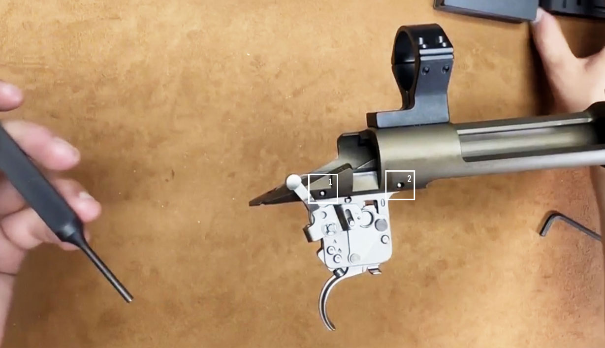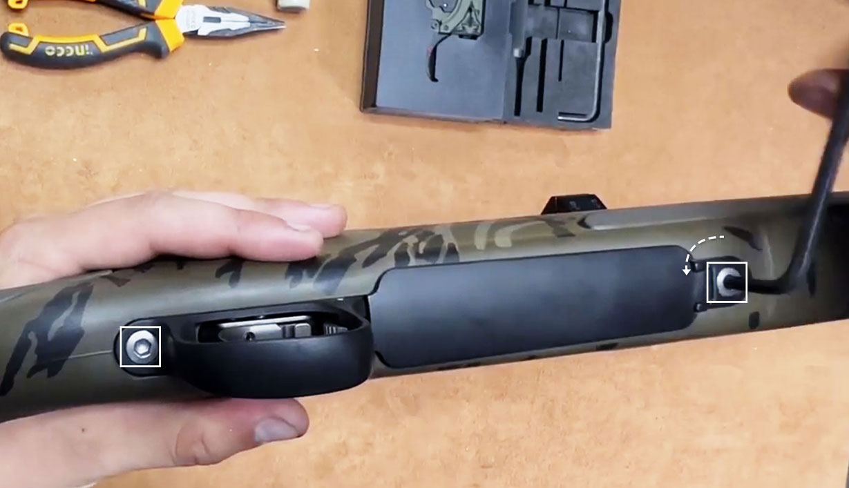 Note: Some rifles have a trigger hanger system. If the rifle has one, there will be a metal piece blocking your access to the trigger pins. In that case, unscrew and remove the trigger hanger system from the action to follow the standard steps to remove the old trigger and install the Reliant trigger. Tip: Make note of the hanger system’s orientation before removing it. You will need to reinstall it the same way.