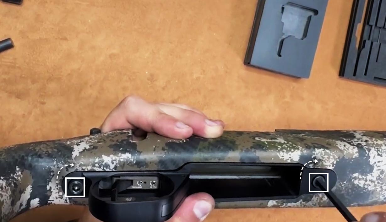 Turn the rifle upside down, revealing the bottom metal plate and two action screws.